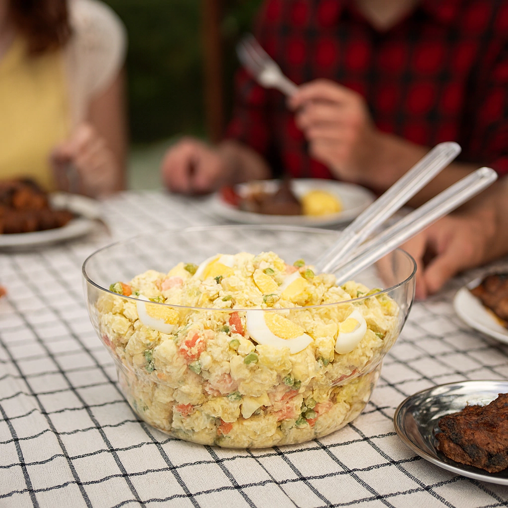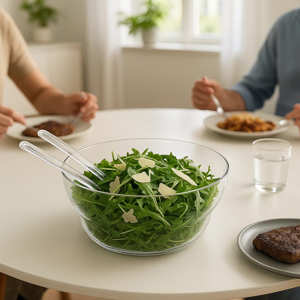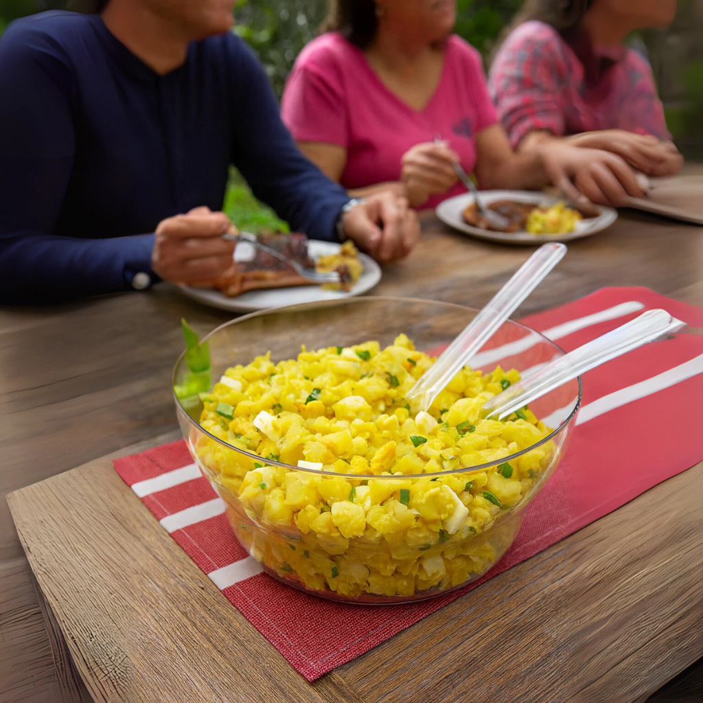 Material: Acrílico Medidas: Alto: 11 cm Diámetro: 25,5 cm Diámetro de base: 18,5 cm Largo de cubiertos: 27,5 cm